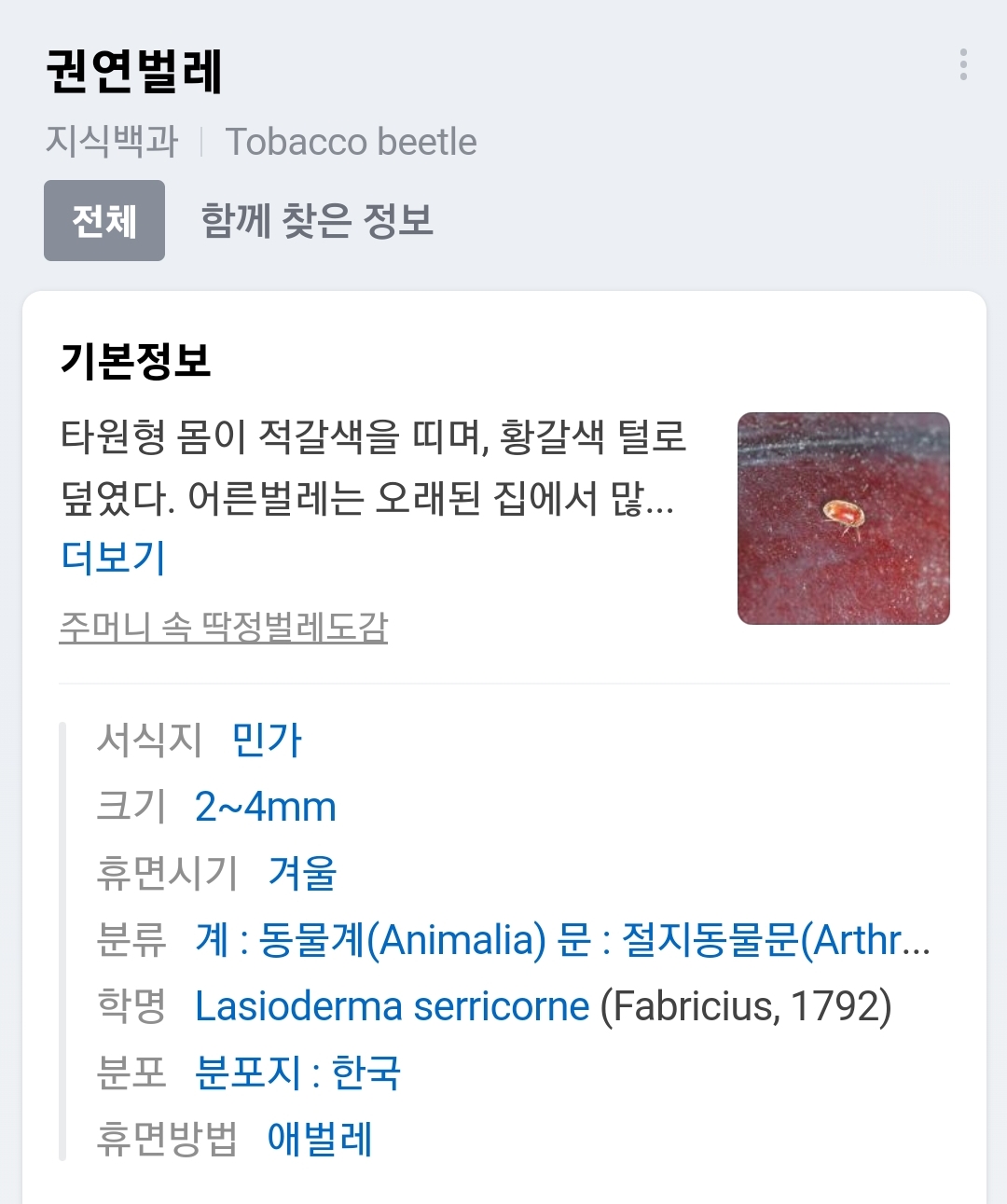 권연벌레는 동글동글하게 생긴 벌레인데 적갈색의 빛깔을 띄고 있습니다. 제 나름 딱정벌레라서 자칫 손으로 건들거나 누르게되면 톡하는 소름돋는 소리를 내지요. 오래된 집에서 많이 보이는 애벌레과 곤충입니다.