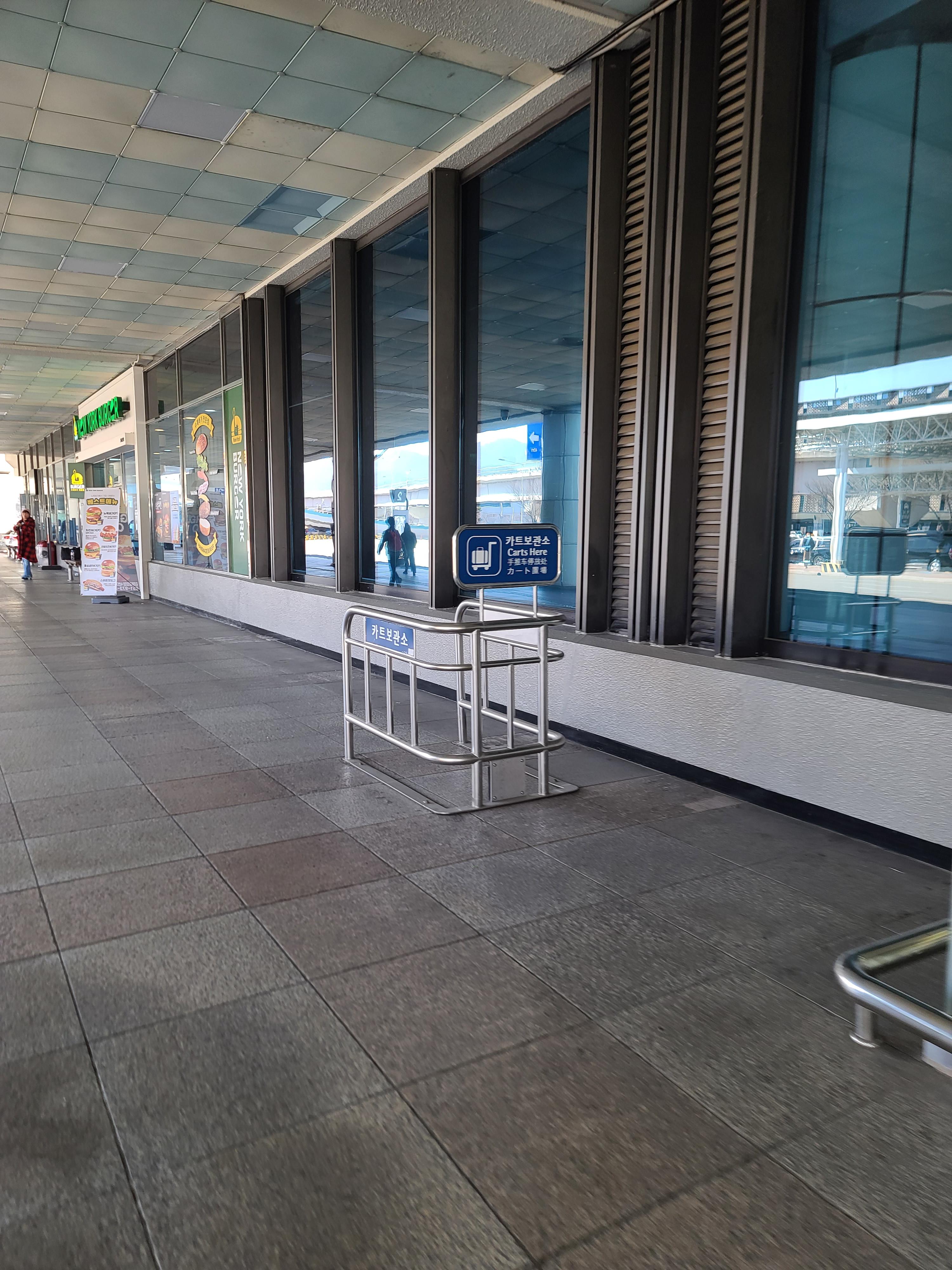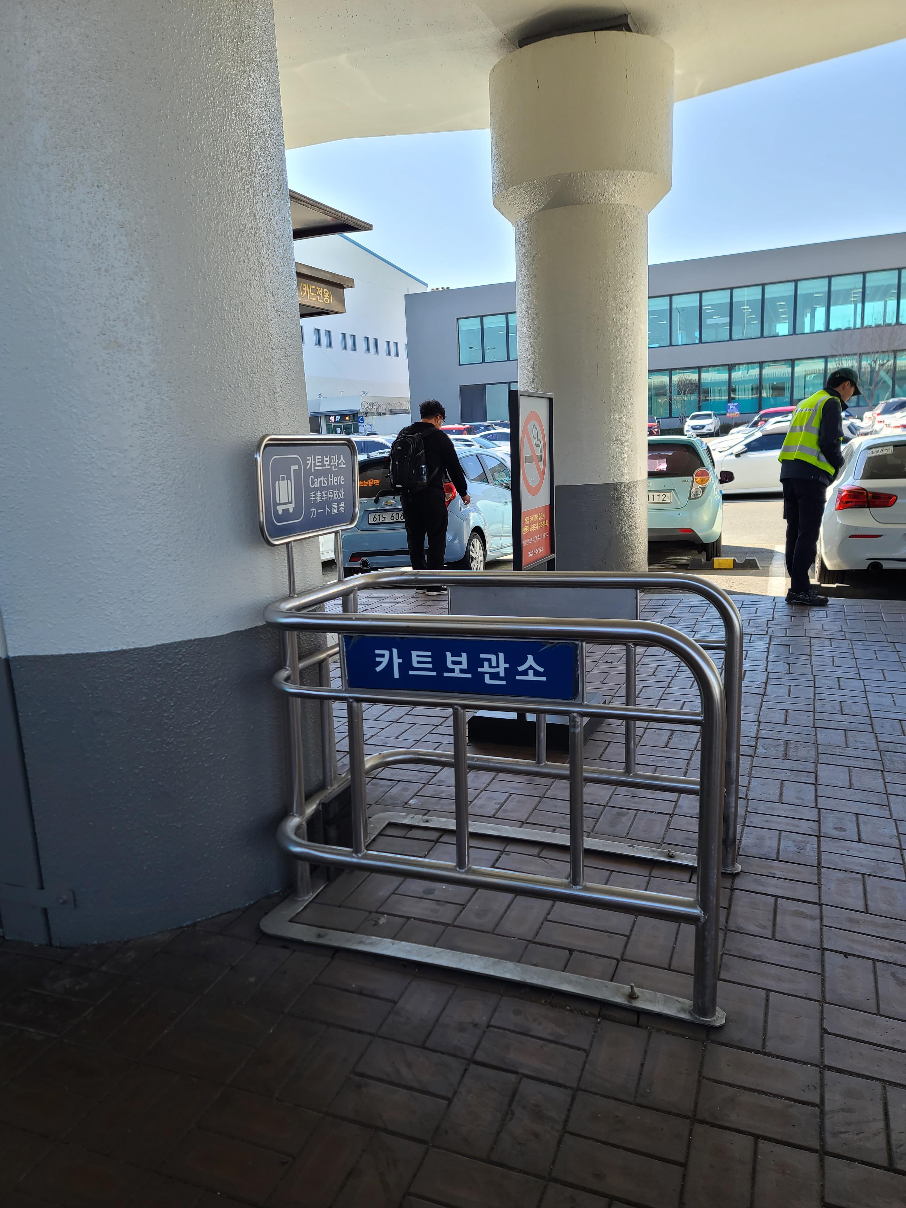 흡연구역 바로 맞은편에도 카트 보관소가 위치해 있습니다. 역시나 입구 근처는 카트가 없네요. 경전철을 이용하시는 분들은 부산 공항역 1번 출구에 내린 뒤 바로 캐리어 카트에 짐을 옮겨 담는 것이 현명해 보입니다.