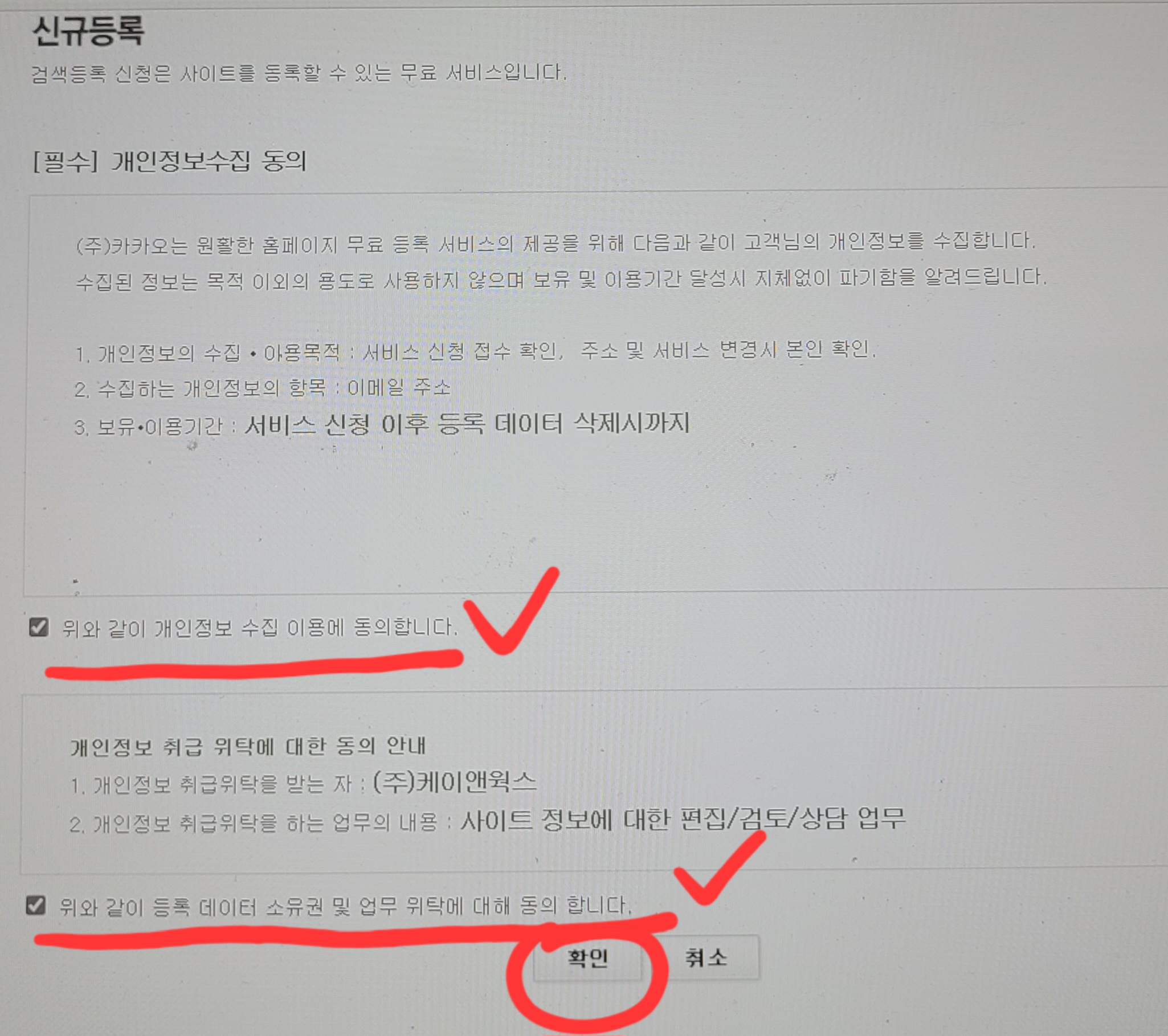 4. 신규 등록을 위한 동의 항목을 모두 선택한 뒤 확인을 눌러주세요.