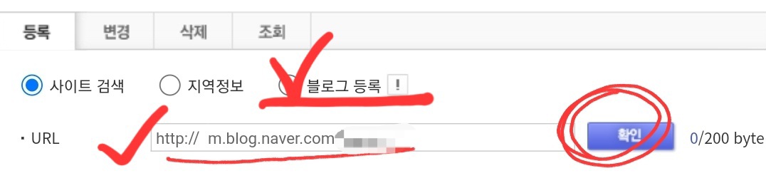 등록 칸에서 네이버 블로그 주소를 등록하면 됩니다. 기본적으로 사이트 검색이 체크되어 있을거예요. 사이트 검색이 아닌 3. 블로그 등록을 누르고 URL을 등록한 뒤 확인을 눌러주세요.