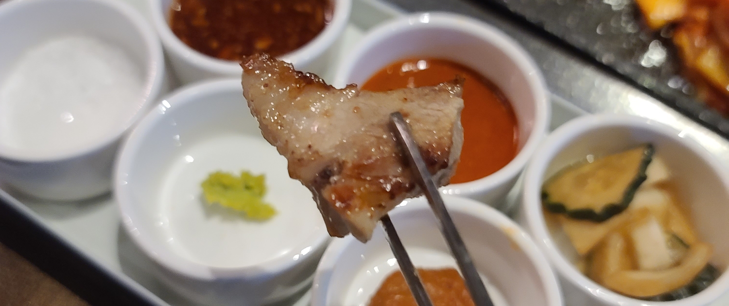 기름에 축축하게 익혀진 야채들도 곁들여서 가브리살을 먹었어요. 솔직히 말해서 환상적인 맛은 아닙니다. 그냥저냥 먹을만한 고기집이예요.