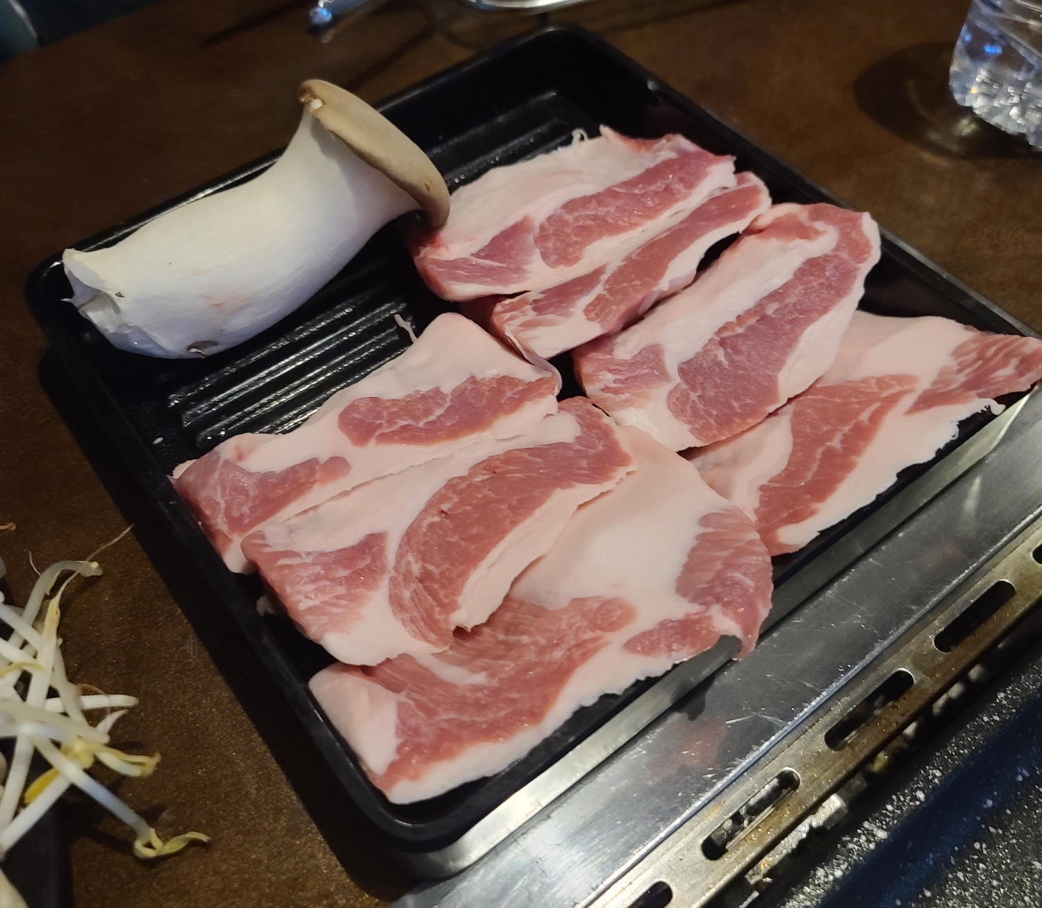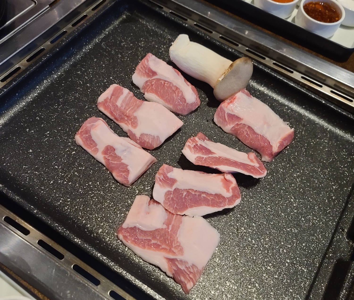 저는 가브리살 3인분을 주문했고요. 주문 후 시간이 얼마 지나지않아 고기가 준비되었습니다. 큼직한 송이 버섯도 하나 준비되어져 왔네요.