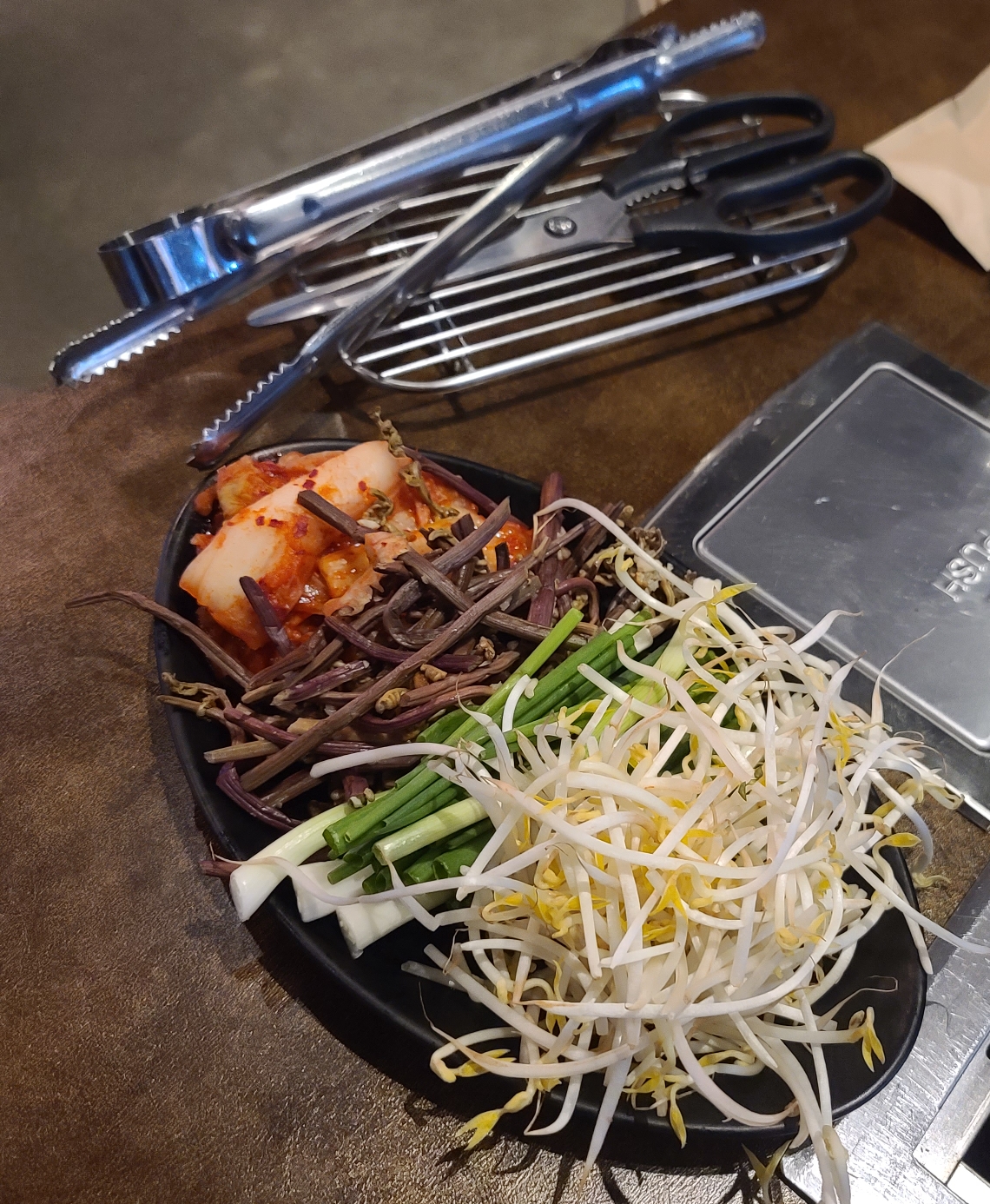 김치 고사리 쪽파 콩나물이 나와요. 고기 기름에 노릇하게 익으면서 풀이 죽으면 너무 맛있습니다 ㅠ
