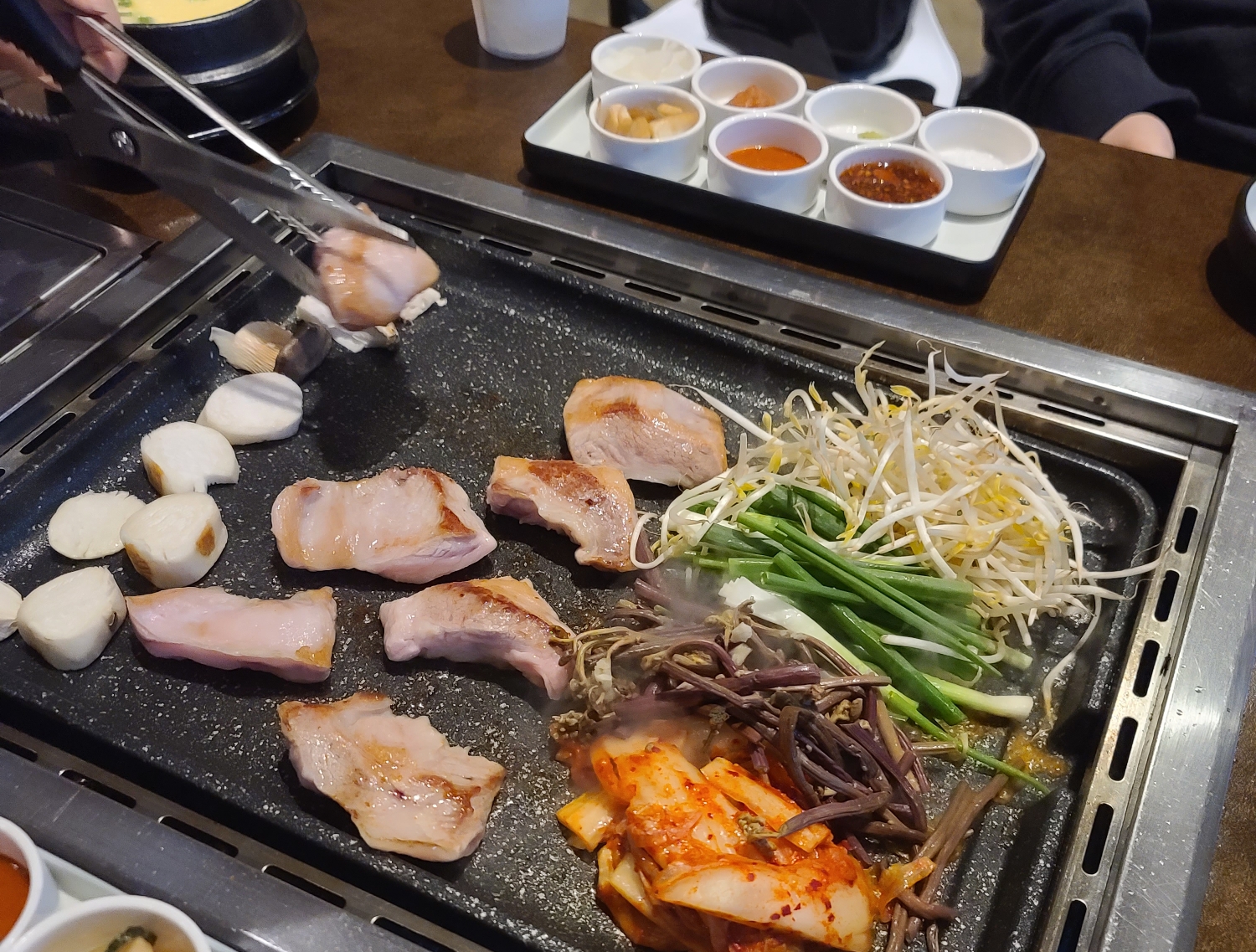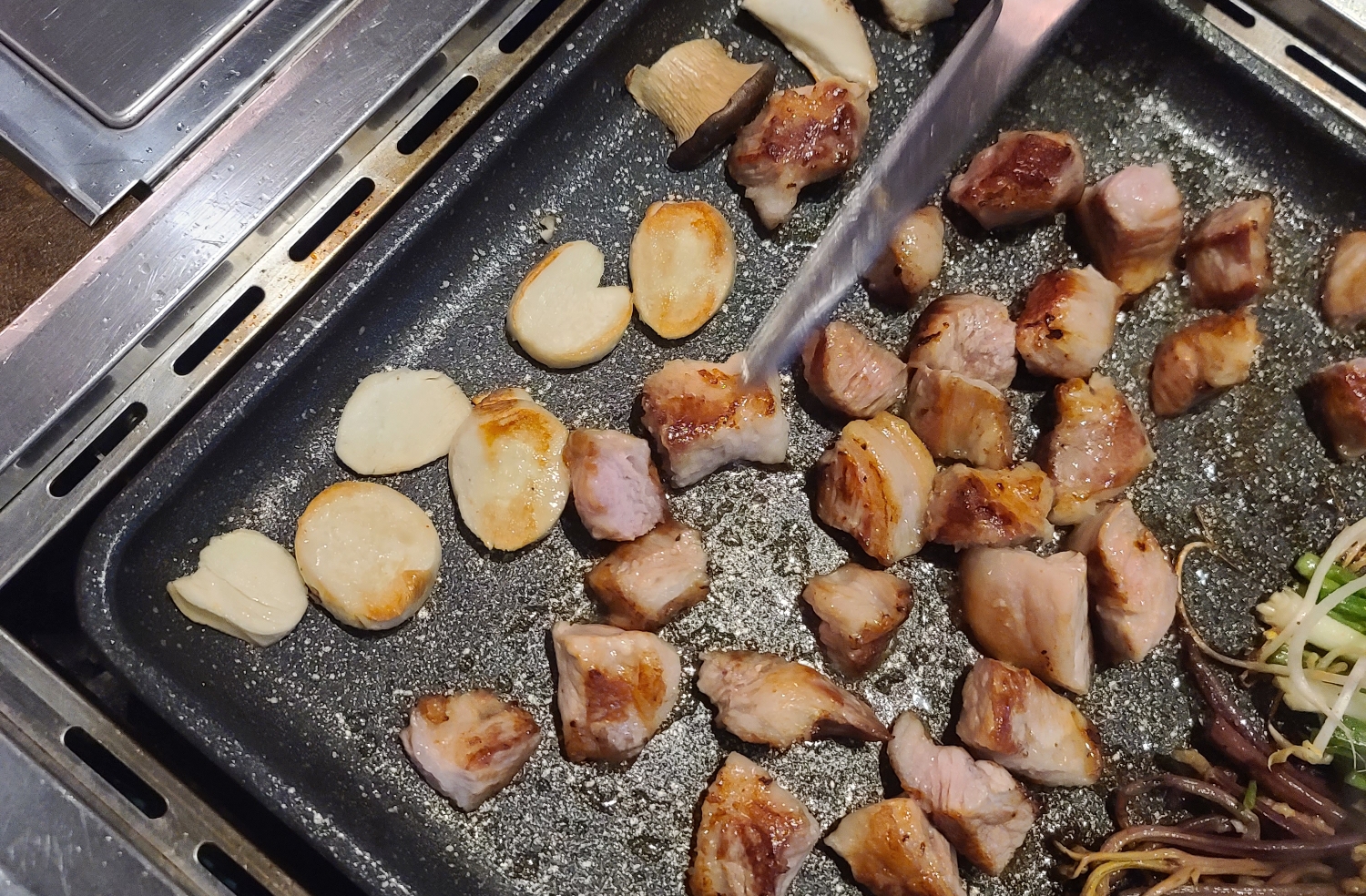 저는 고기를 조금 더 익히고 가위로 몇 번의 커팅을 더했습니다. 그리고 지글지글 익어가는 고기를 작은 크기로 자르니 비로써 3인분처럼 보이더군요.