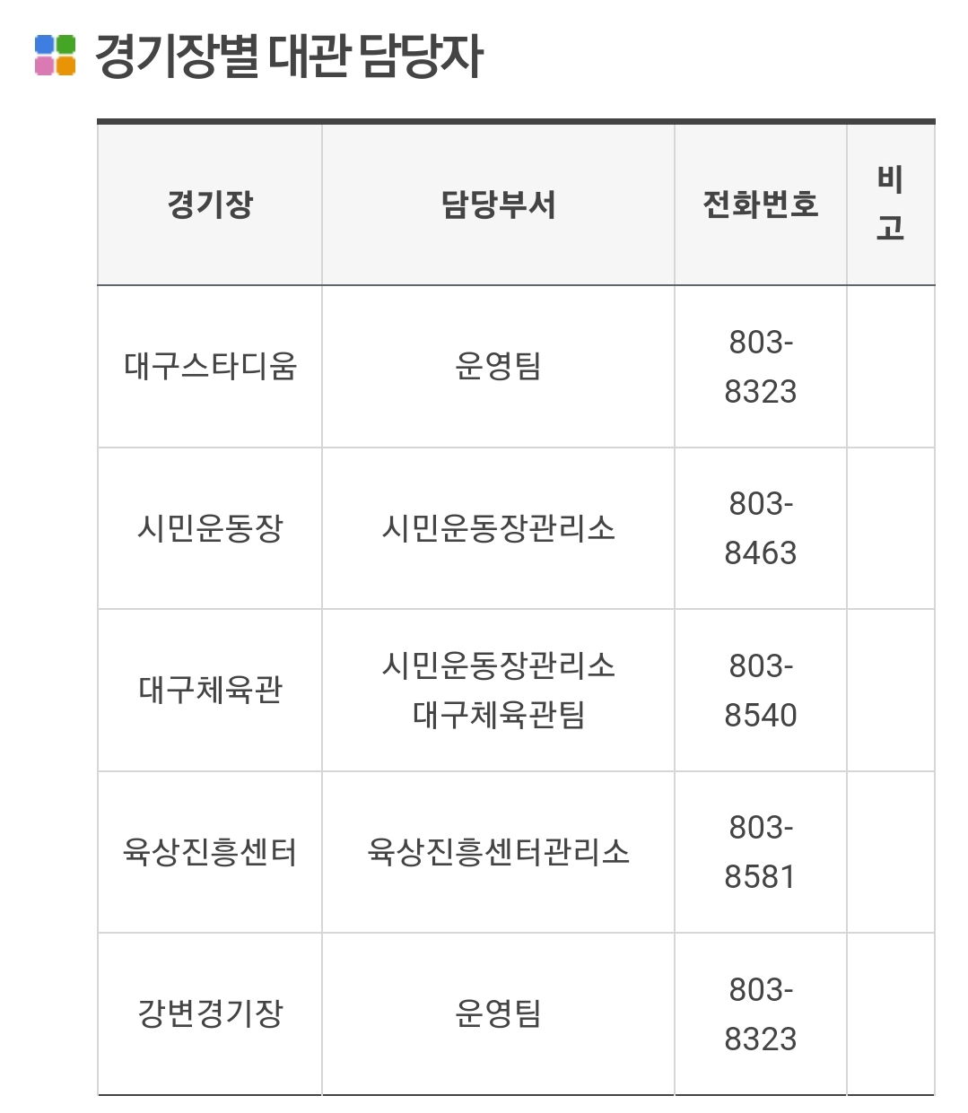 대구 경기장별 대관 담당자의 내선 번호입니다. 참고하세요. 대구광역시 홈페이지에도 잘 나와있습니다.