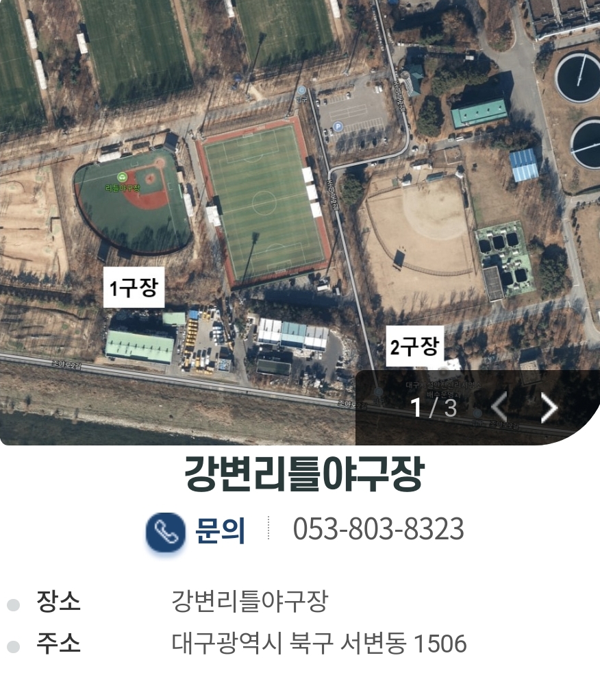 방금 누른 체육시설에 대한 정보가 뜨게됩니다. 강변리틀야구장 장소와 주소 문의 전화번호가 있습니다.