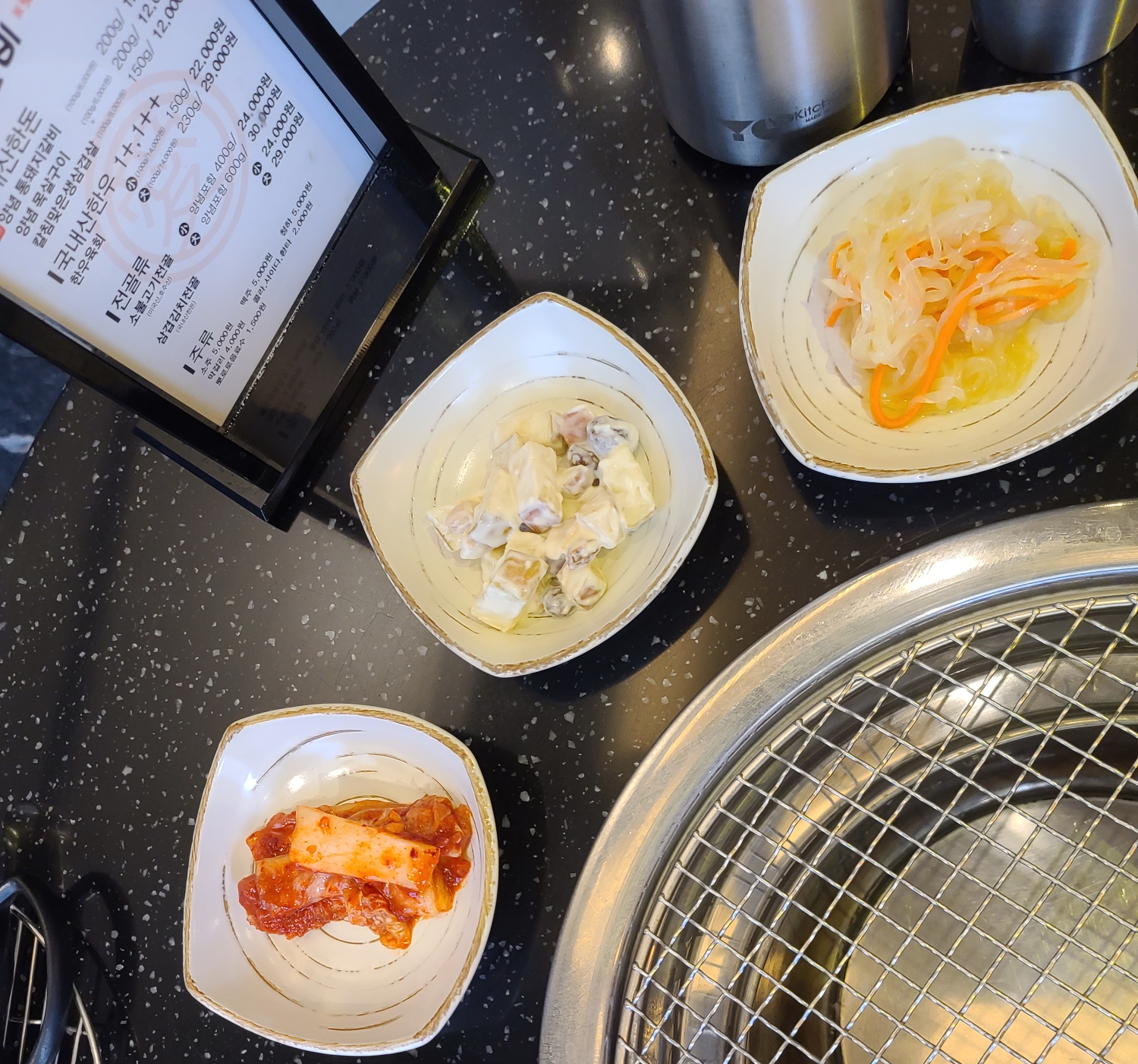 김치, 사과마요샐러드, 겨자냉채(?) 등 다양하고 푸짐한 반찬이 먼저 나와요. 기본 반찬만해도 벌써 푸짐하답니다