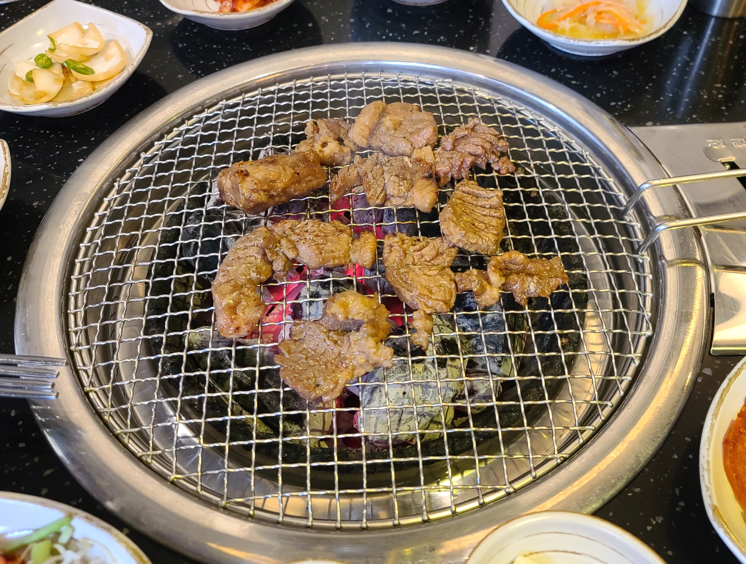사장님이 이렇게 불판에 몇 점을 올려주시고는 가십니다.