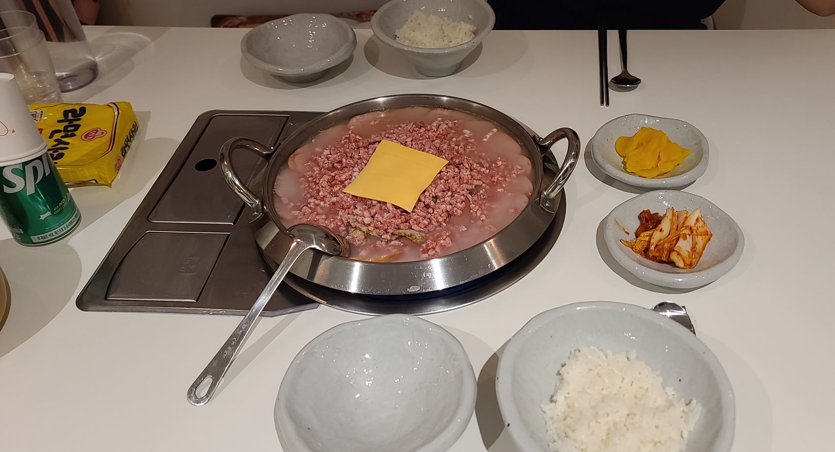 어느 정도 부찌를 즐기다가 라면사리도 투하해봅니다. 짭짤하고 기름기가 많은 국물 덕에 라면이 굉장히 맛있습니다. 부대찌개가 끓을수록 점점 짠맛이 강해졌지만, 첫 맛은 잊을 수가 없네요. 맛있었습니다.