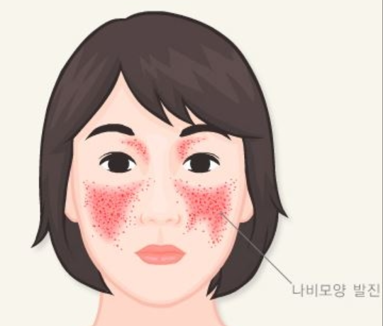 가장 특징적인 증상은 콧잔등 부위의 나비 모양의 홍반이 나타나는 것과 햇빛 과민성입니다. 루푸스병의 80%에서 뺨의 발진이 나타납니다.