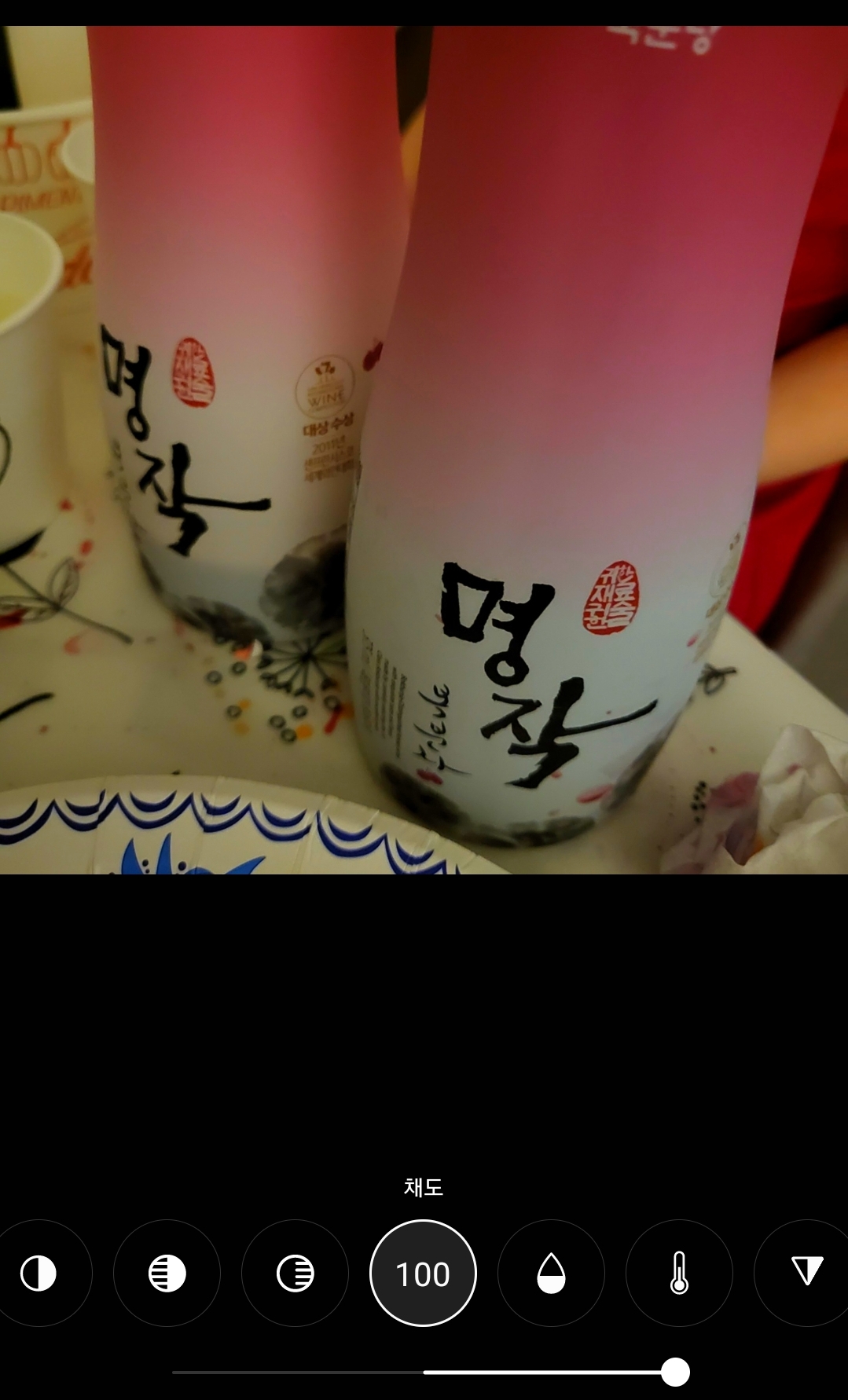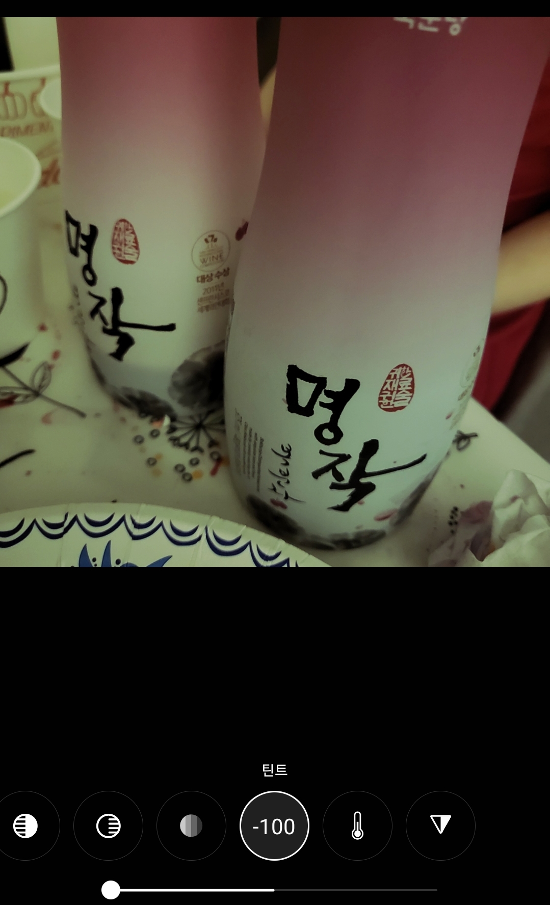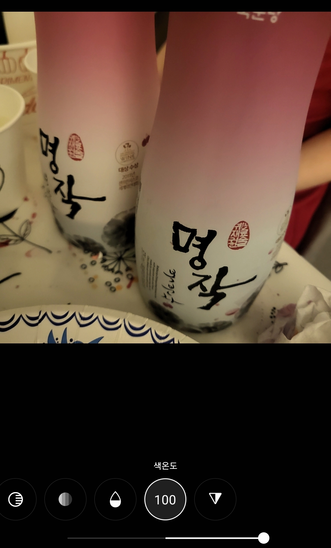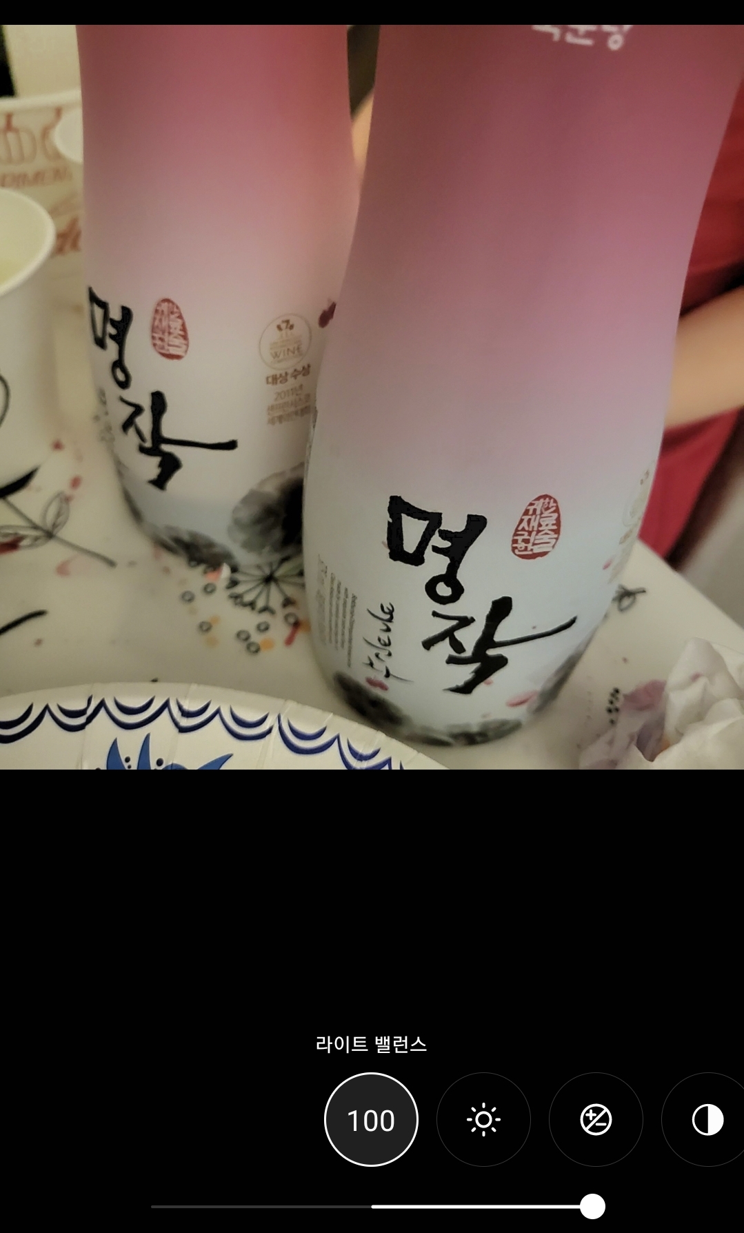 라이트 밸런스 / 화이트밸런스 를 최대로 올려보았습니다. '명작' 글자 부분을 둘러싼 술병의 배경이 우리의 눈에 보이는 것과 마찬가지로 하얗게 변했습니다. 말 그대로 화이트로 밸런스가 맞춰졌네요