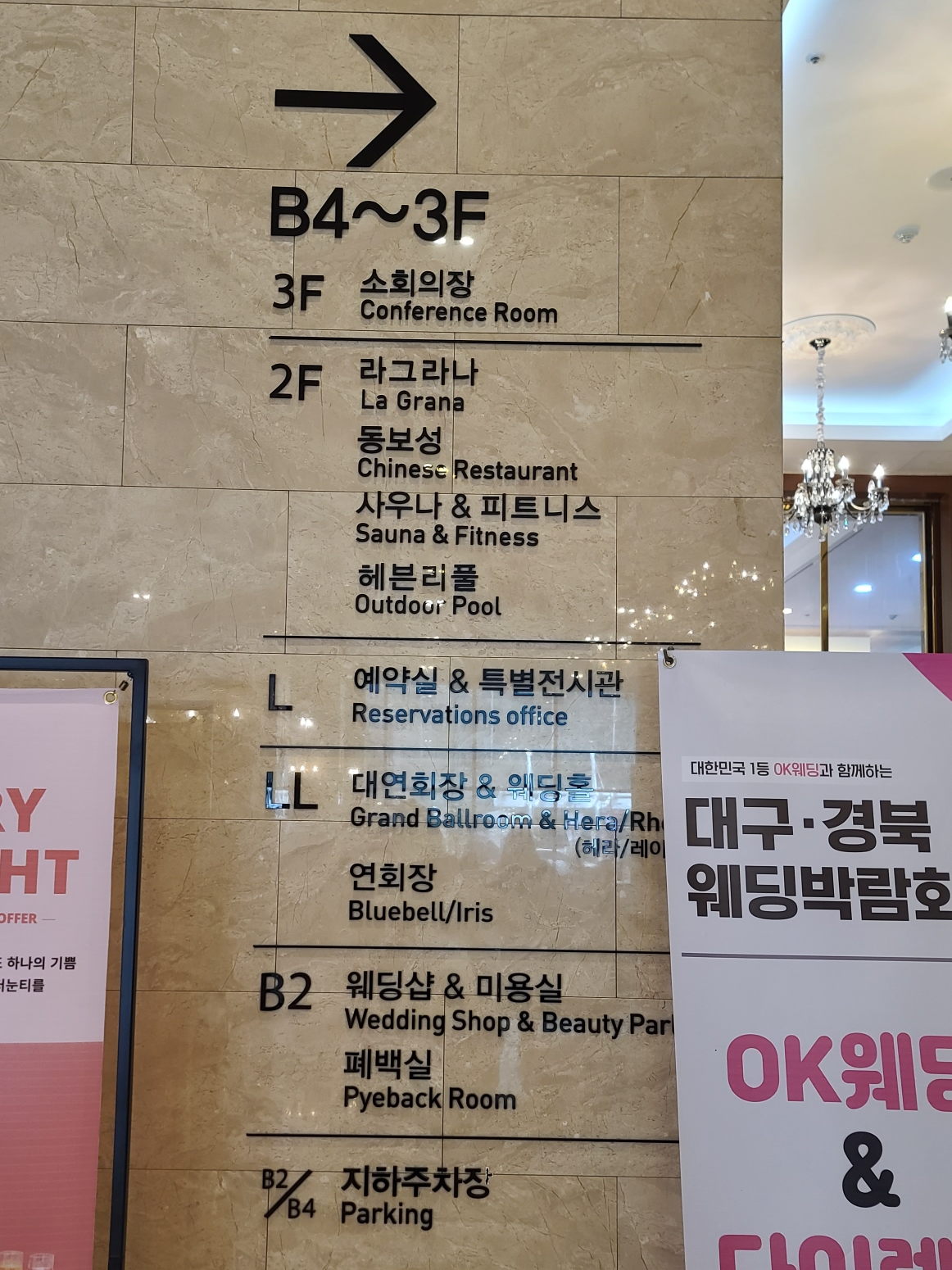 결혼식은 엑스코인터불고 2층 그랑파티오 홀에서 열렸습니다. 엘리베이터를 타고 LL층으로 이동했어요.