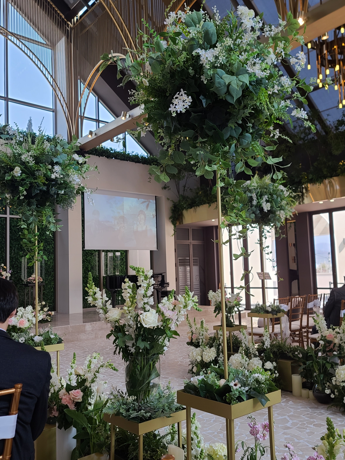 신부입장이 끝나면 결혼식은 여기서 진행되는데요. 여기도 야외분위기나는 꽃장식이 있어 예뻤어요.