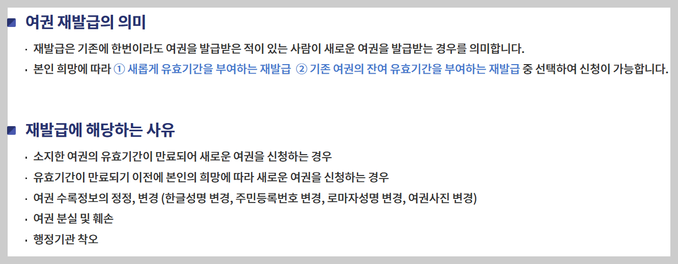유효기간이 남아있는 기존 여권을 소지하고 있다면 재발급 신청 시 반드시 지참해야 합니다.