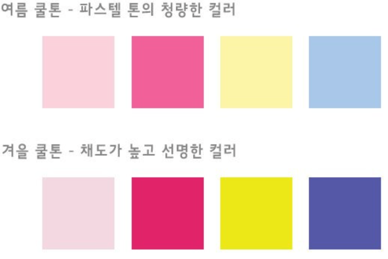 여름쿨톤은 전체적으로 밝고 여리한 인상을 주며, 겨울쿨톤은 시크하고 도회적인 인상이 강한 편입니다.