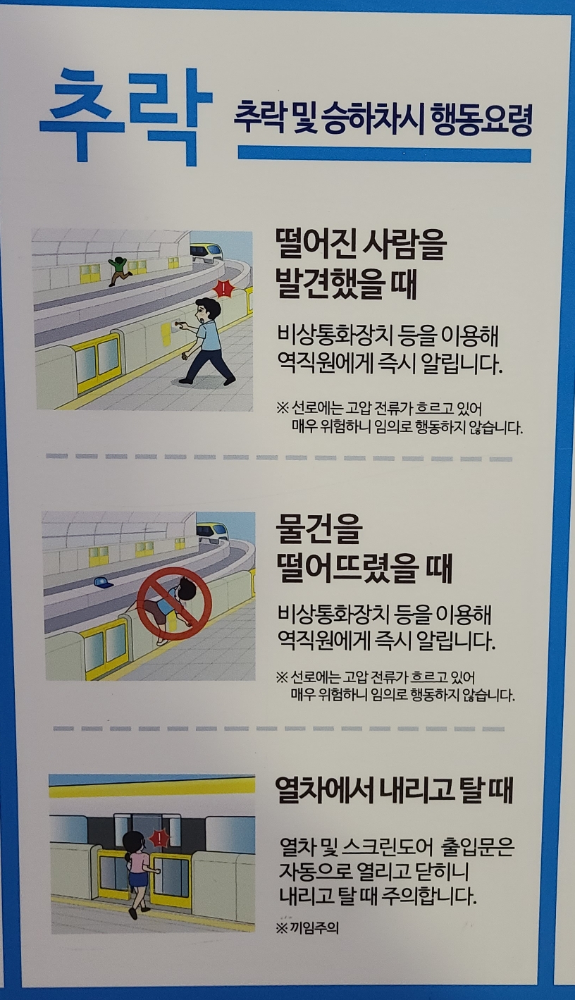 영웅 심리가 발동하여 직접 내려가서 구하겠다는 생각은 버리셔야 합니다. 지하철에서 추락한 사람을 발견한 경우 즉시 비상통화장치등을 이용해 지하철역 직원에게 알려야합니다.