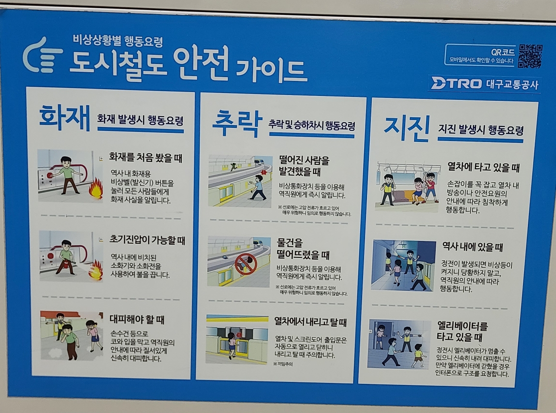 얼마 전 대구의 지하철을 이용하다가 한 포스터를 발견하였습니다. 도시철도 안전 가이드라는 건데요. 대구교통공사에서 만든 지하철 비상상활별 행동 요령을 간략하게 포스터로 만든 것이었어요. 지하철 화재 추락 지진 발생 시 대처방법을 담고 있더라고요. 지하철을 기다리며 슬쩍 봤는데 너무 좋은 내용인 것 같아 사진을 몇 장 찍어왔습니다.
