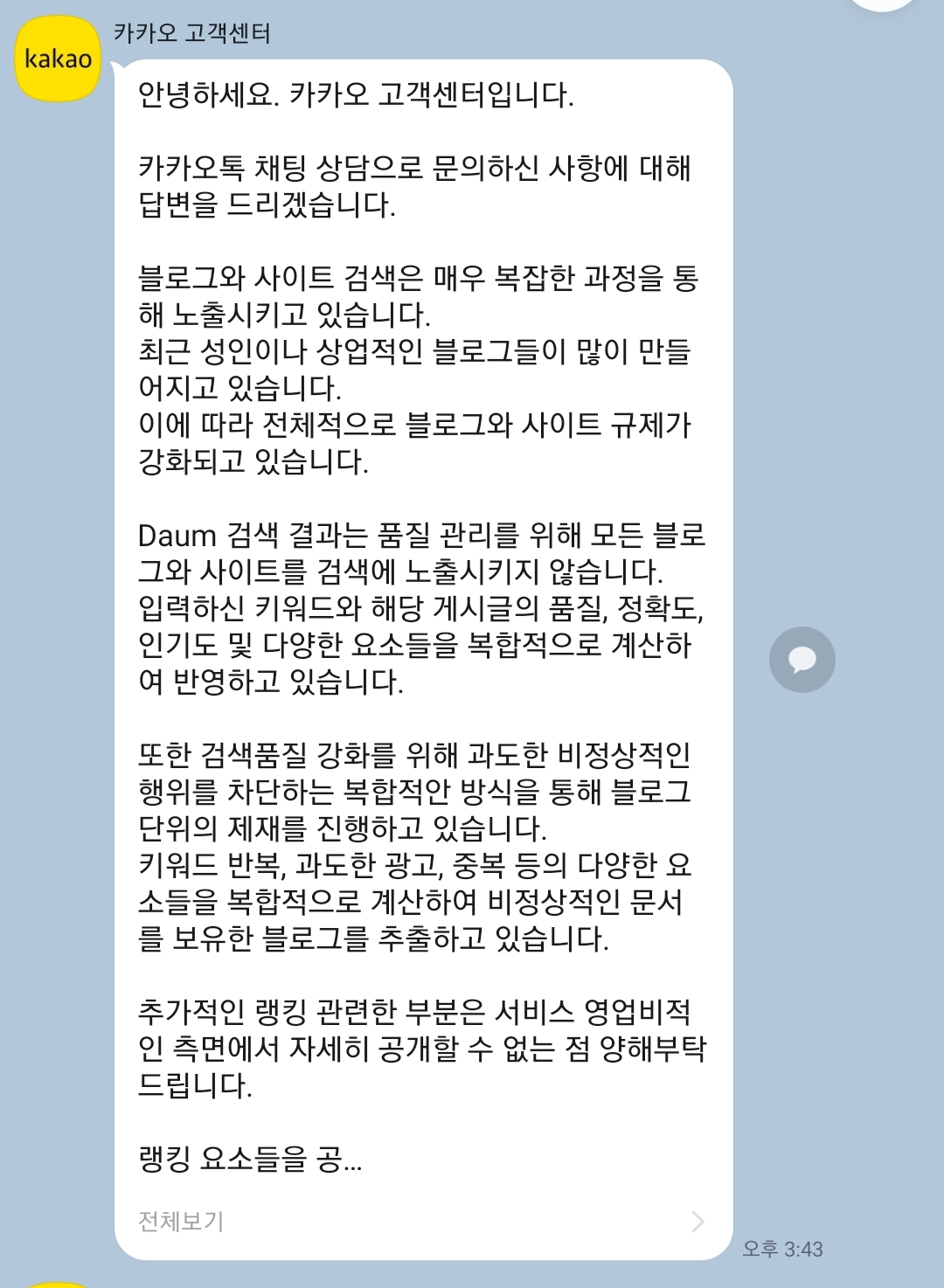 티스토리 저품질에 걸린 게 이주일 전입니다. 근데 일주일만에 저품질을 또 겪게됐어요. 그리고 이전과 같이 카카오 고객센터에 문의를 남겼습니다. 결과부터 말하자면 티스토리 저품질 탈출에 대차게 실패했습니다.