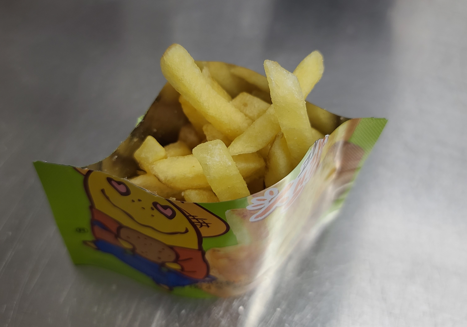 자가비 과자는 감자튀김 형태로 생겼어요. 덕분에 입을 크게 벌리지 않아도 됩니다. 그래서 와삭거리는 소리는 덜해요.