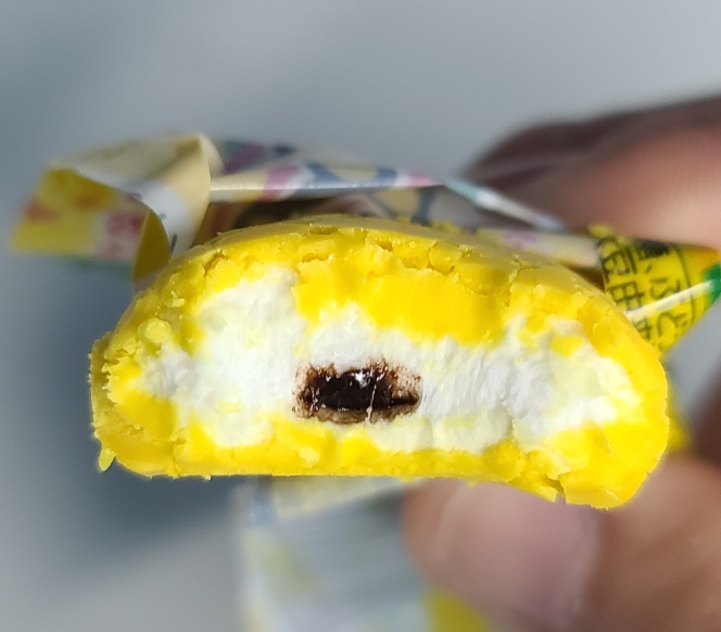 직접 먹어보려고 포장지를 오픈했어요. 노란 마시멜로가 모습을 드러냈는데요.. 바나나향이 가득합니다.