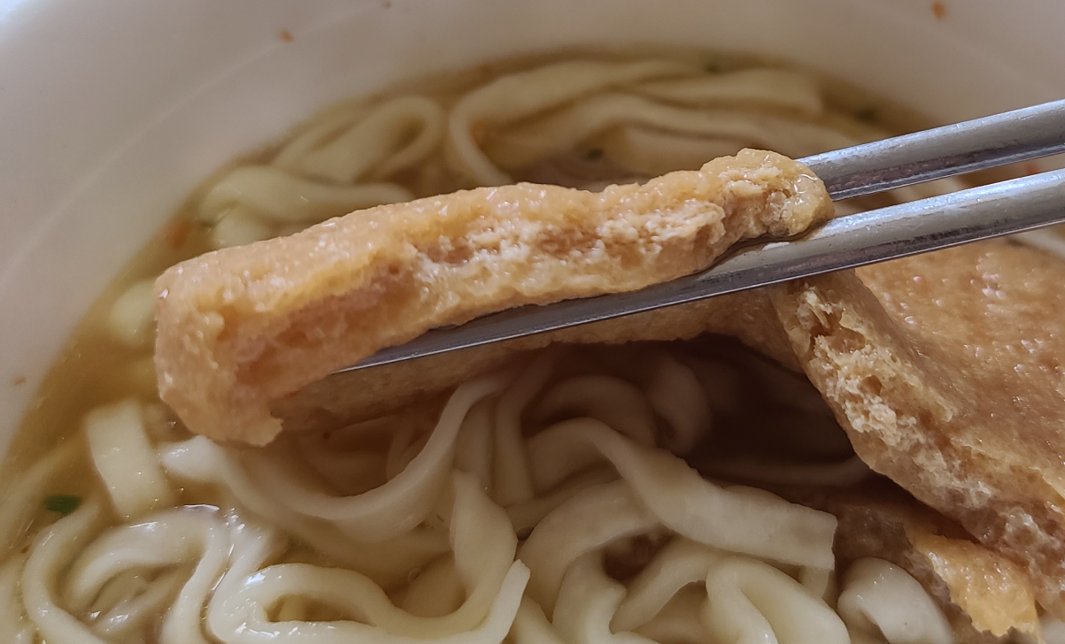 쯔유의 나라답게 유부우동 컵라면 국물에서 쯔유의 맛이 살짝 납니다. 유부가 국물을 머금고있어 촉촉하게 먹을 수 있었구요. 국물이 조금 짰는데, 유부와 함께 국물을 먹으니 단짠단짠해서 맛있었습니다.