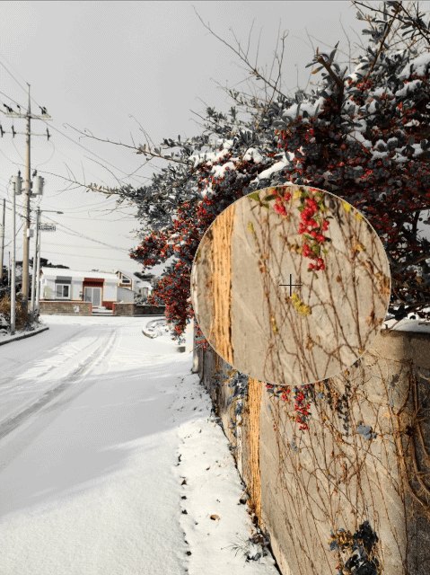눈이 내려 전체적으로 하얗고 색이 없는 모습을 볼 수 있습니다. 다채로운 사진도 좋지만 오히려 이런 사진이 포토에디터로 부분 흑백 기능을 적용하게되면 더욱 멋있게 변하지요.