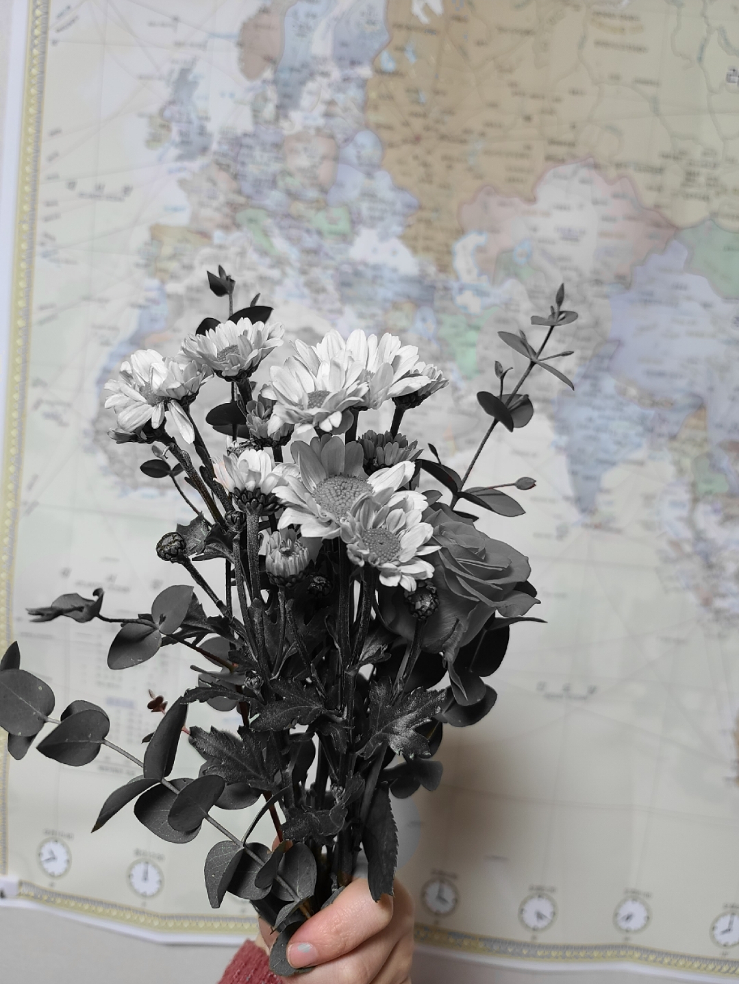 사진 속 꽃송이들만 흑백으로 처리해 보았어요. 주변 배경과 손가락 옷깃 등은 색감이 살아있는 것에 반해 꽃들은 생기를 모두 잃은 모습입니다. 묘한 느낌의 사진이 되었어요