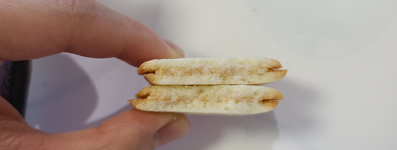 하지만 조금 다른 맛이 납니다. 정품 시로이 코이비토는 훨씬 부드러운 쿠쿠다스 같은 과자에 치즈맛이 감도는 내용물이 채워져있습니다.