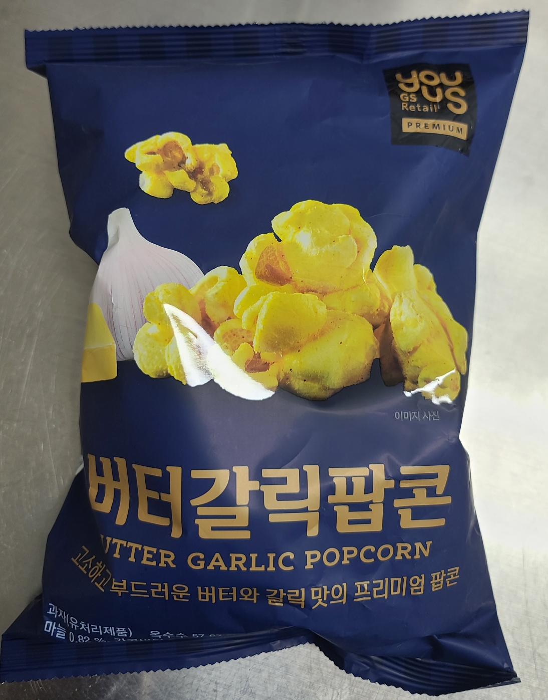 팝콘에 고소한 버터와 한국인의 입맛에 잘 맞는 갈릭이 합쳐서 맛있는 과자가 탄생했습니다. 포스팅을하며 생각해보니 포장지 사진 선정이 아주 탁월하군요.