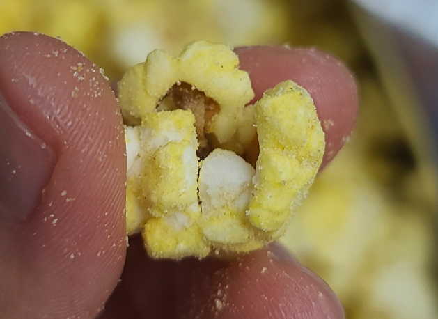 노오란 팝콘들이 가득합니다. 2000원이라는 거금을 주고샀는데 굉장히 만족스럽습니다. 요즘은 질소포장이라는 말이 있을 정도로 과대포장된 과자가 많지요. 그에 비하면 탁월한 양입니다.