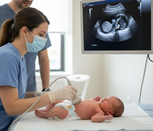 출생 후에는 신생아의 복부 초음파를 통해 진단을 내릴 수 있으며, 여러 개의 낭성 구조와 정상 실질이 보이지 않는 양상이 특징입니다.