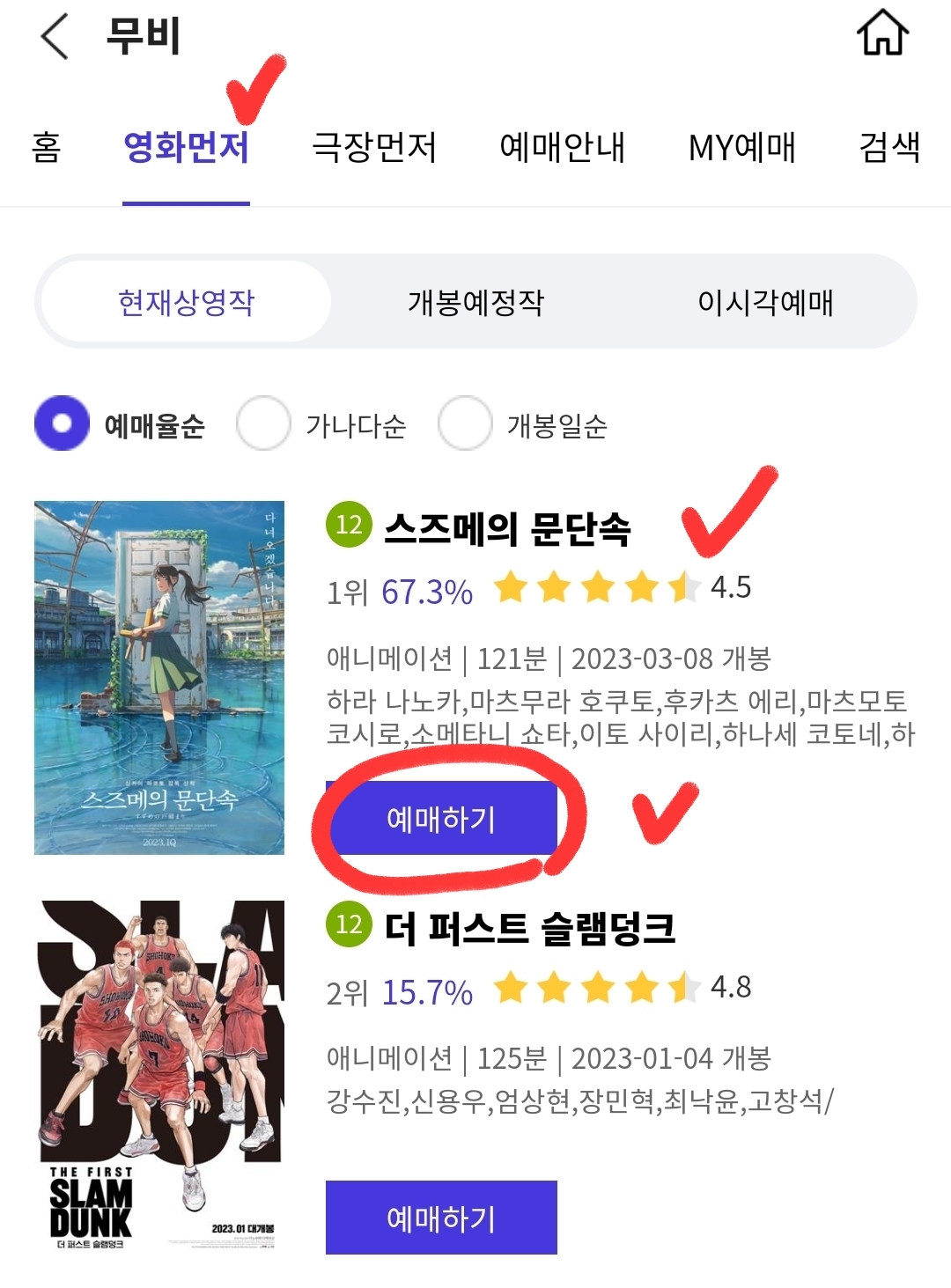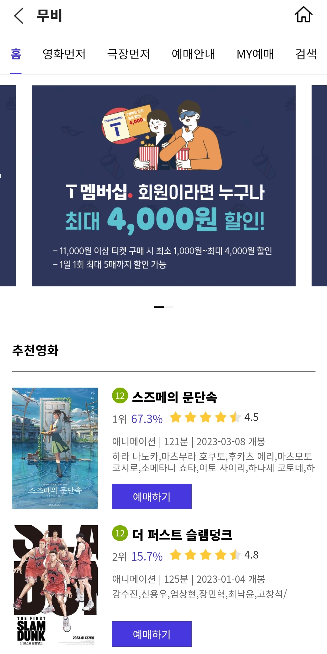 저는 영화를 먼저 골랐어요. 요즘 스즈메의 문단속이라는 애니메이션 영화가 핫하길래 T멤버십 vip로 영화 예매를 진행해보았답니다!