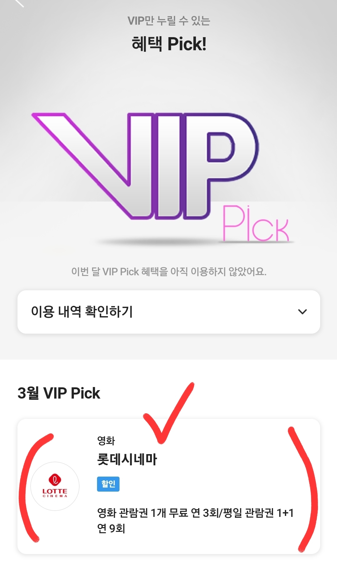 이번달 혜택이라고 쓰여진 곳 아랫쪽에 나와있는 vip 영화관람 횟수는 실 사용 횟수에따라 줄어들어요. 저는 지난 번에 1회를 사용하였기에 연 2회가 남아있다고 뜹니다.