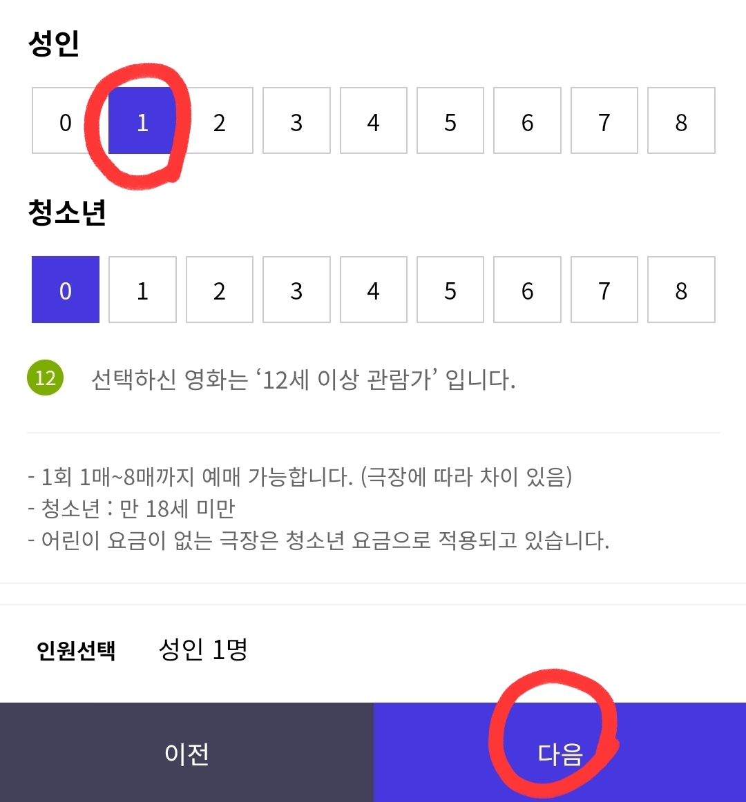 또한 1인 무료영화를 적용하고 11000원 이상 결재 시 4000원 할인 혜택도 받고싶으신 분들은, 네모 박스에 체크 후 할인예매적용 버튼을 눌러주세요.