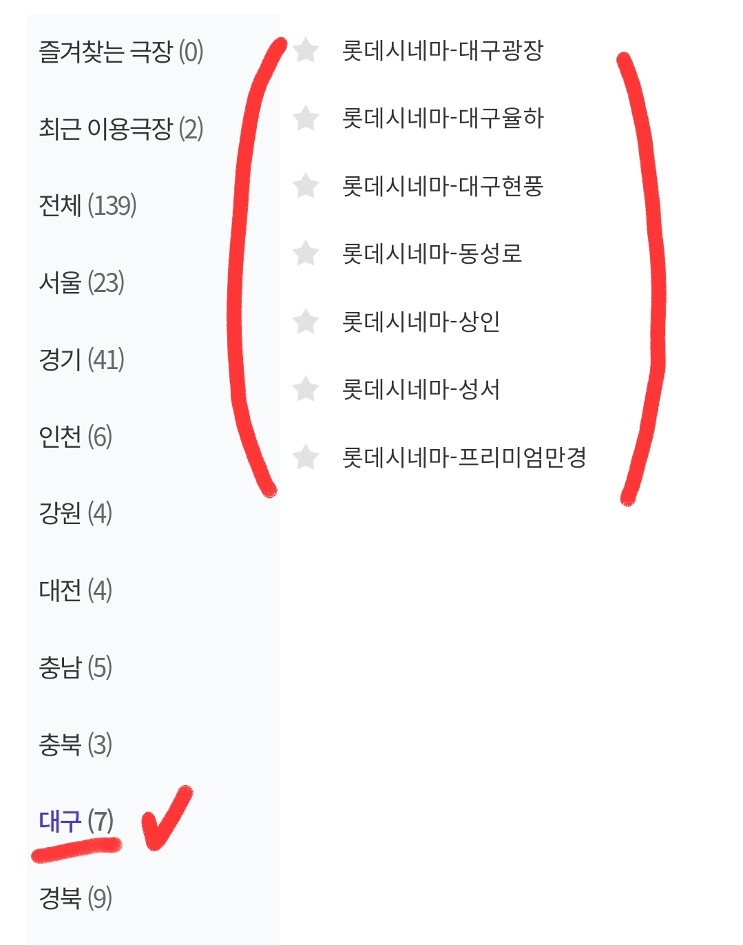 직접 지역을 눌러보며 보고싶은 위치의 영화관을 눌러주셔도 좋습니다. 저는 대구에 살아서 대구에 있는 롯데시네마 프리미엄 만경관을 선택했어요.