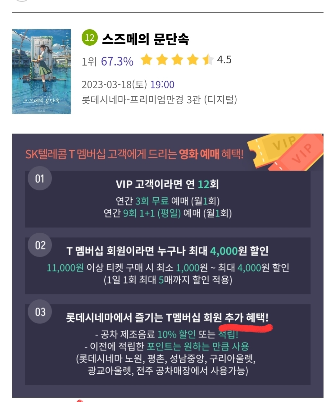 이 단계까지 왔다면 다시 한 번 Skt T멤버십 vip 혜택이 언급됩니다. 처음 무료영화를 예매하신다면 한 번 읽어보면 좋아요